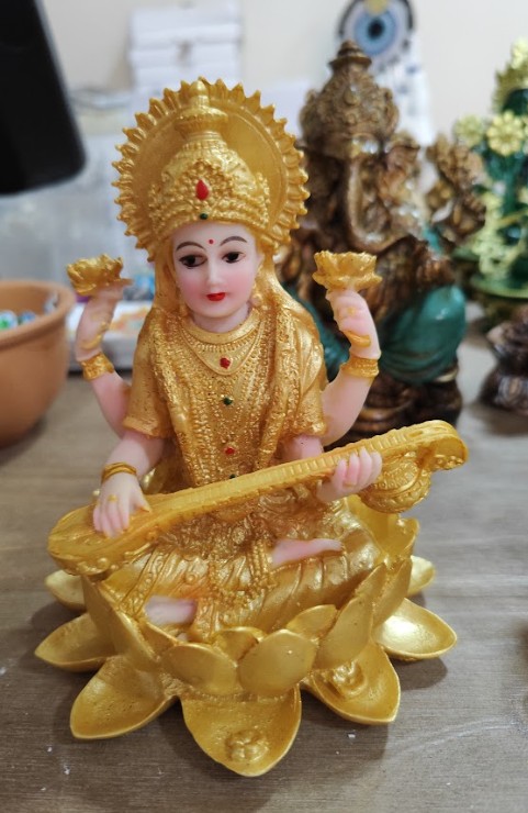 Esta estatua de 15 cm de altura, fabricada en resina de alta calidad, muestra a la diosa sentada sobre una flor de loto, vestida en un elegante traje dorado y portando un veena, el instrumento musical tradicional que simboliza la armonía espiritual y artística.