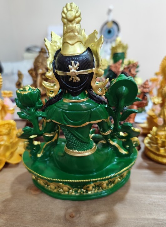 Esta figura de 20 cm de altura, cuidadosamente elaborada con acabados en verde intenso y detalles dorados, transmite serenidad y poder espiritual, siendo ideal para altares personales, espacios de meditación o como pieza decorativa con profundo significado espiritual.