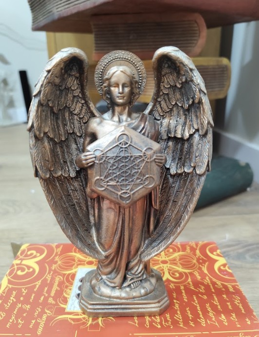Esta estatua de 20 cm de altura, elaborada en resina de alta calidad con acabado en color bronce, muestra a Metatrón con alas abiertas, sosteniendo el Cubo de Metatrón en sus manos, símbolo que ayuda a canalizar energía, equilibrar el cuerpo y la mente, y elevar la vibración espiritual.