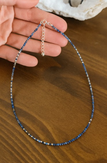 Exclusiva gargantilla de lapislázuli natural facetado, engarzada con delicadas cuentas que realzan el brillo y la intensidad de su característico tono azul profundo con destellos dorados. El diseño incluye un cierre en plata de ley, lo que garantiza calidad y elegancia.