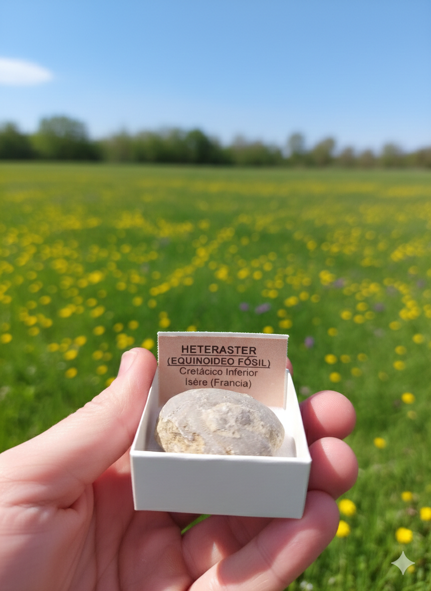El Heteraster es un fascinante fósil de erizo de mar que habitó nuestros océanos durante el Cretácico. Al ser materia orgánica que se ha mineralizado a lo largo de millones de años (generalmente en calcita o sílice), posee una energía de resistencia, longevidad y conexión con los orígenes de la vida.