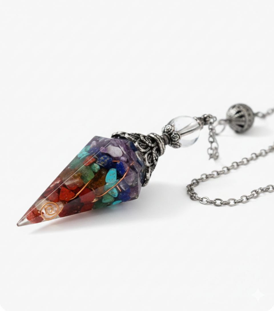 Armonía total en la palma de tu mano. Este péndulo es mucho más que una herramienta de radiestesia; es un transmutador energético completo. Al combinar la tecnología de la orgonita con las piedras correspondientes a los siete centros energéticos, este péndulo actúa como un sintonizador de precisión para tu cuerpo sutil.