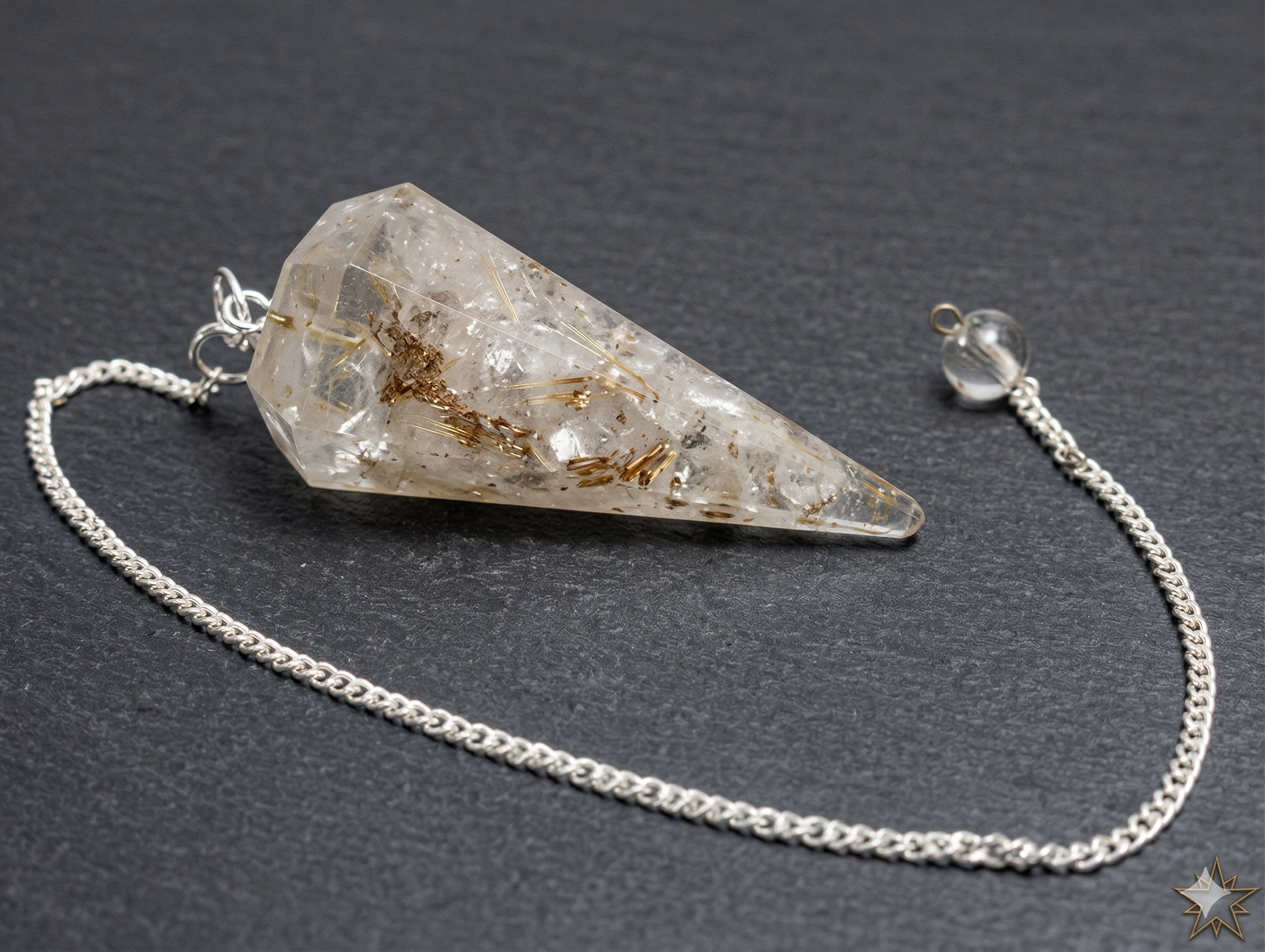 Este péndulo no es solo una herramienta de radiestesia; es un aliado energético meticulosamente diseñado. Su cuerpo facetado de orgonita transparente alberga un núcleo de cuarzo rutilado dorado de alta calidad, cuyas finas e hipnóticas agujas de rutilo (conocidas como «cabellos de Venus») son claramente visibles. Esta combinación única crea una sinergia potente: