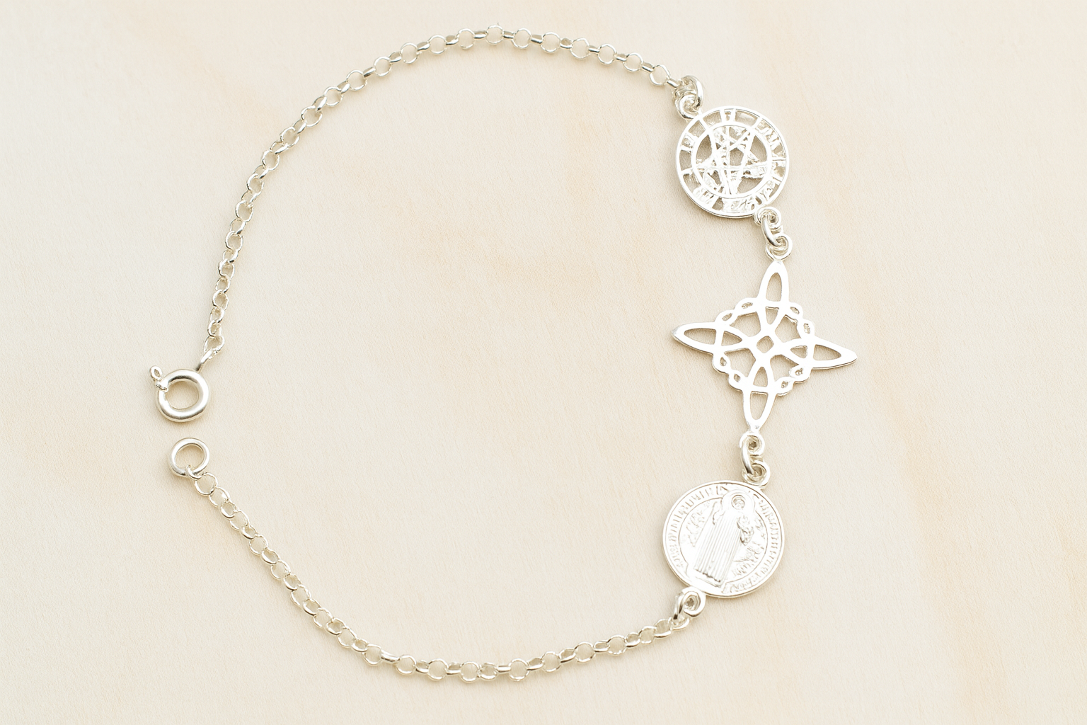 La Pulsera Triple Protección está elaborada en plata 925 de alta calidad y combina tres poderosos símbolos protectores: el Nudo de Bruja, el Tetragramatón y la Medalla de San Benito. Esta joya no solo destaca por su elegancia y detalle artesanal, sino también por su profundo significado espiritual y energético.